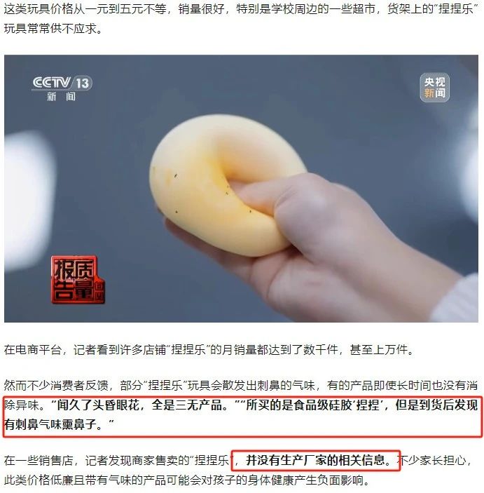 孩子爱不释手的“捏捏乐”100%含甲醛?央视建议了!2025-07-14央视记者随机购买了市面上热销的11款软胶“捏捏乐”玩具,送交权威机构检测。 结果让人不寒而栗:11款产品,100%检出了甲醛…